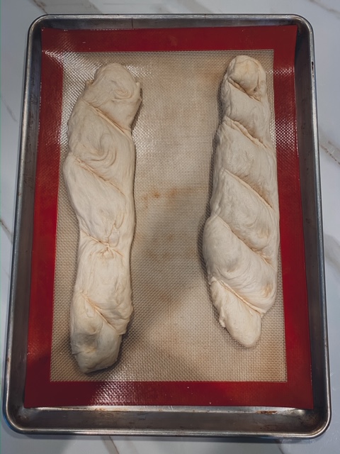 12. Uncover the baguettes and transfer to a lightly greased baking sheet.