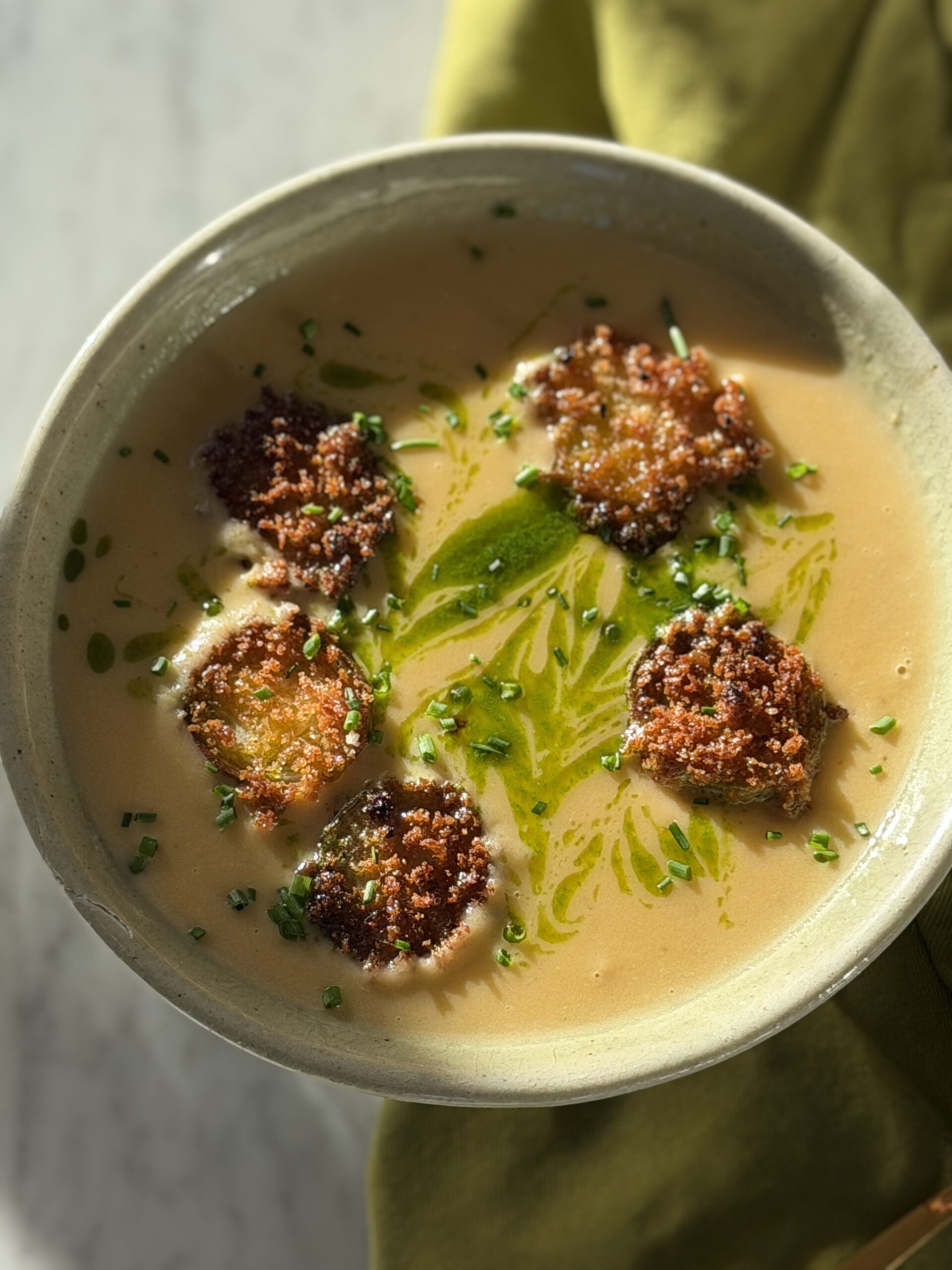 At the table, we’d ease in with an Autumn Glow salad — crisp kale, apples, pecans, and apple cider vinaigrette — followed by a cozy bowl of creamy French potato leek soup with chive oil and fried leek croutons.