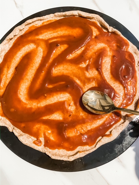 - Spread the BBQ Sauce on your pizza (I like mine pretty saucy) so I lay it on pretty thick.